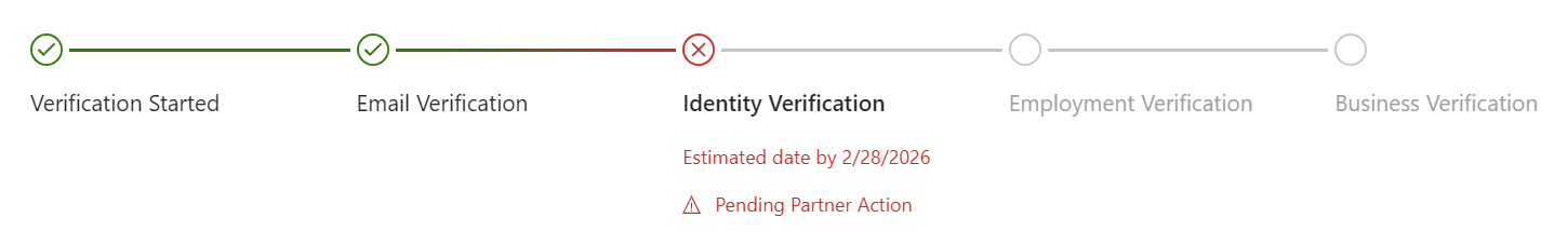 We had to change our registered Partner Center email address from “something@ourdomain.com“ to “firstname.surname@ourdomain.com” and then verify our identity with the MS Authenticator app on a mobile phone. Only then we were verified.