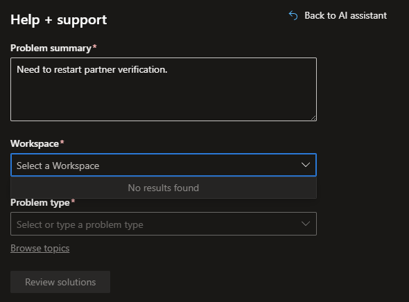 However this support request kept redirecting me back to Partner Center support and then again back to general support. I was able to break the infinite loop by selecting the following support options under general support:
