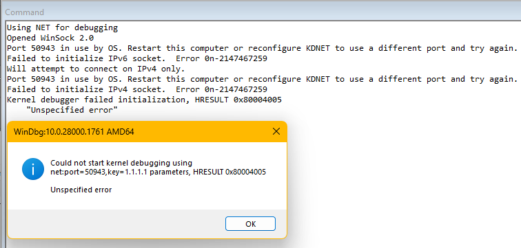 With the latest Windows Updates (April 2026) installed, there are now UDP port exclusions being created by Windows automatically for UDP ports that may be in the 5xxxx range. For anybody who has VMs configured for kernel-mode network debugging with WinDbg (classic or store app), if you’ve chosen your port numbers based on existing WinDbg documentation which suggests port 50000, you may well encounter problems getting WinDbg to begin listening for incoming connections when you do “File → Kernel Debug…” (or CTRL+K), set the port & key values and click “OK”.