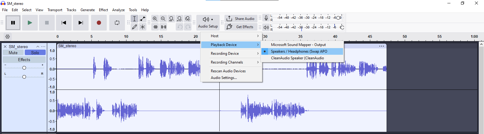 - In the Audacity, I chosen “Swap APO Realtek Speaker” as Playback device and played a .wav audio file.